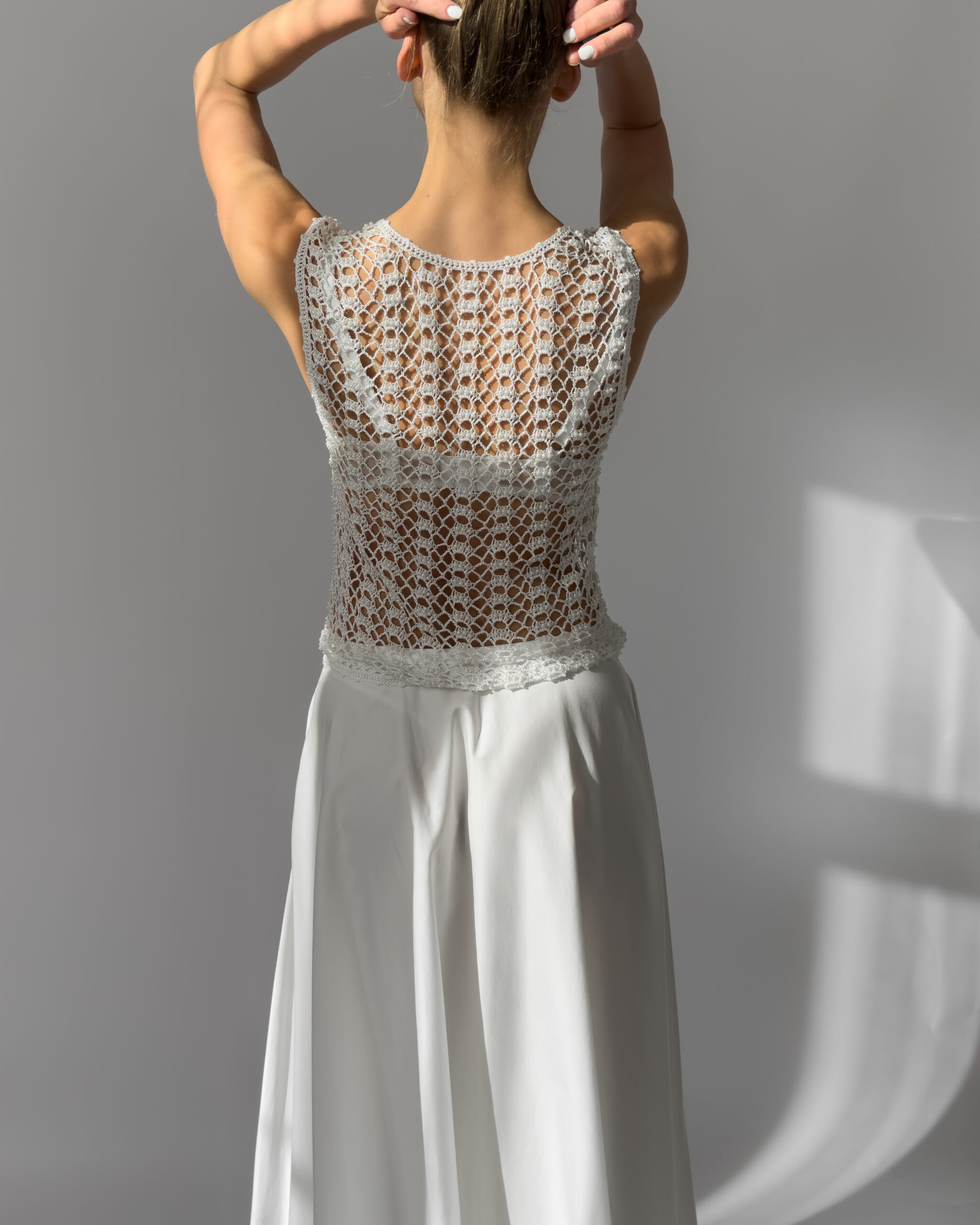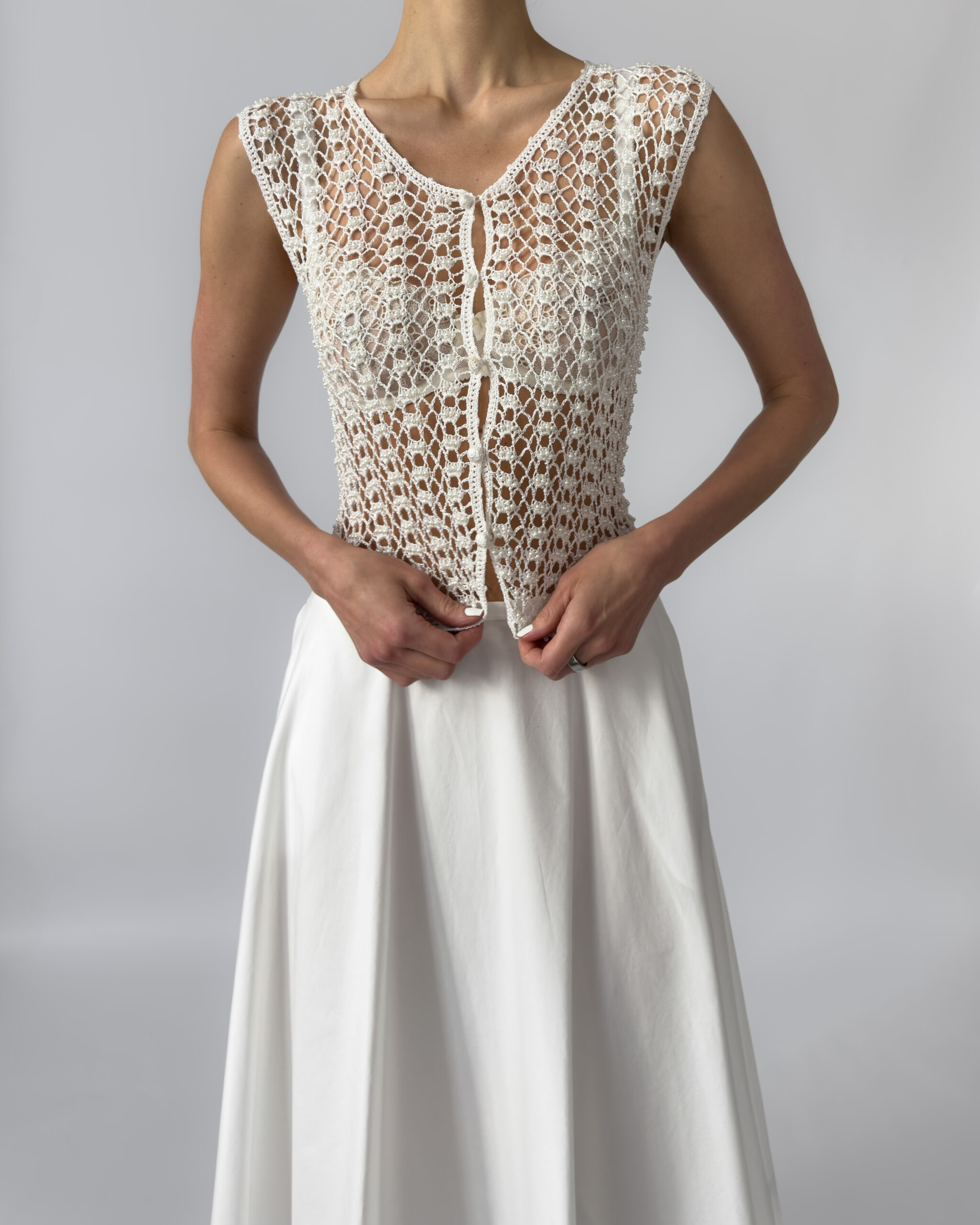 Delicate white vest with hand-embroidered crochet design, adorned with small white pearls. Features a button-up closure and a flattering fit. Perfect layered over dresses or styled with high-waisted trousers.