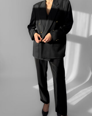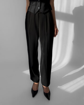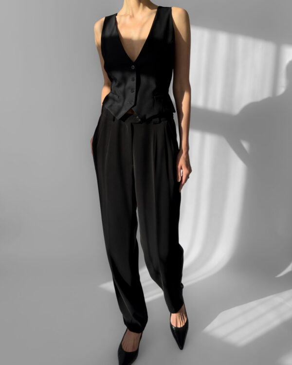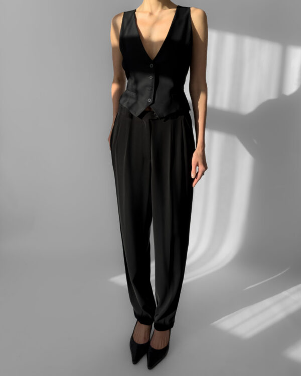 Classic black pleated suit trousers by Franco Callegari. Designed with belt loops, a front zipper closure, two front pockets and soft pleats. Perfect for office wear or paired with heels for an evening look.