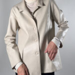 Genuine leather jacket in soft cream white hue. By Delban, this leather jacket features a collar, button up closure and two front pockets. Labelled as size 44, Made in Spain.