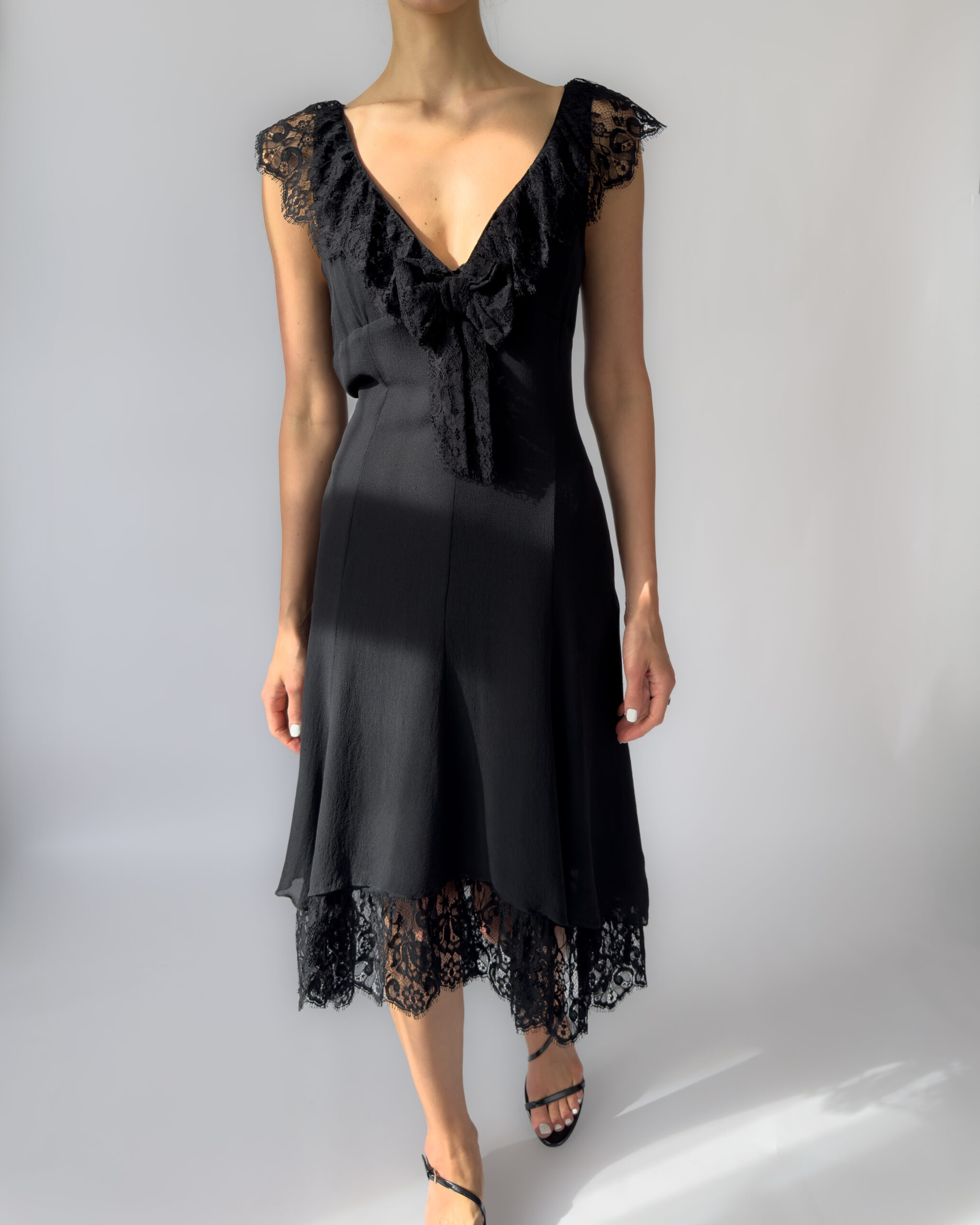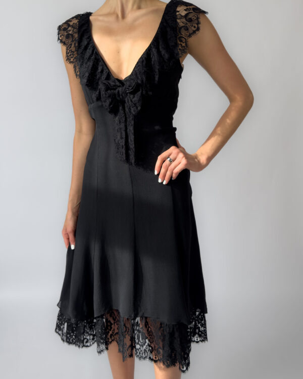 Karen Millen silk lace dress in black, featuring a deep V neckline, delicate lace cap sleeves, and a layered hem with scalloped lace detail. The dress has a flattering, fluid silhouette with a side zipper closure and two layers.