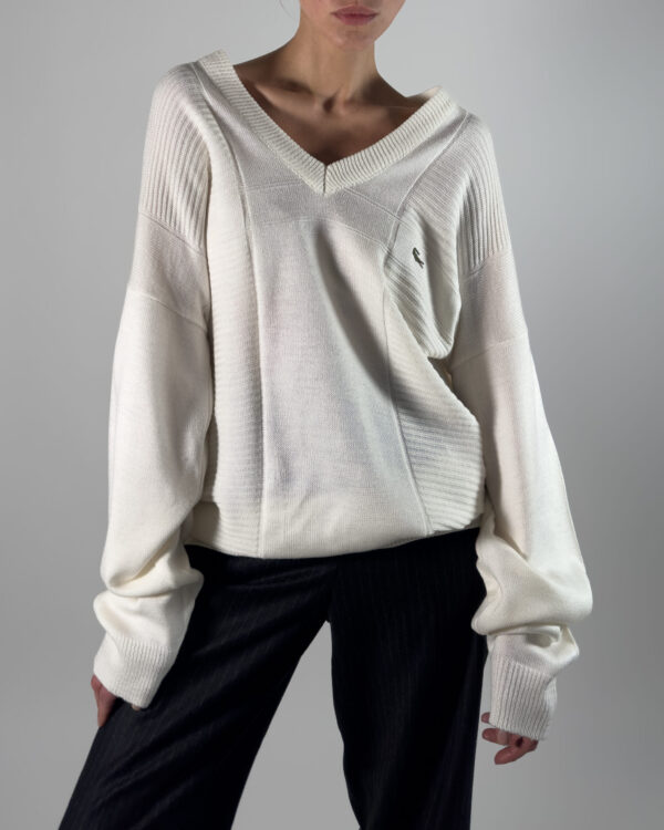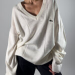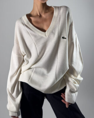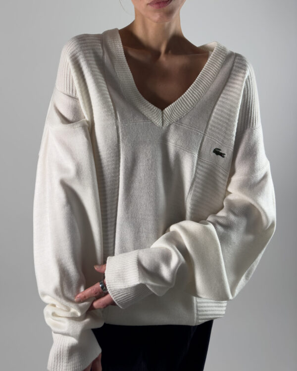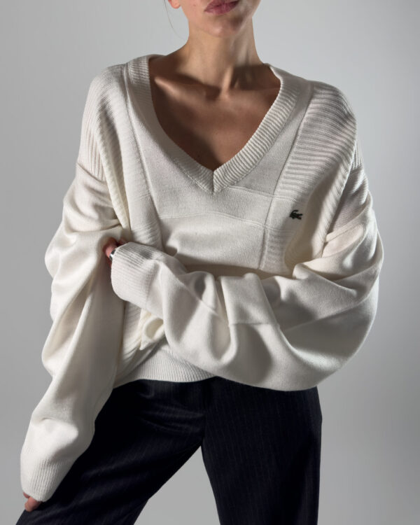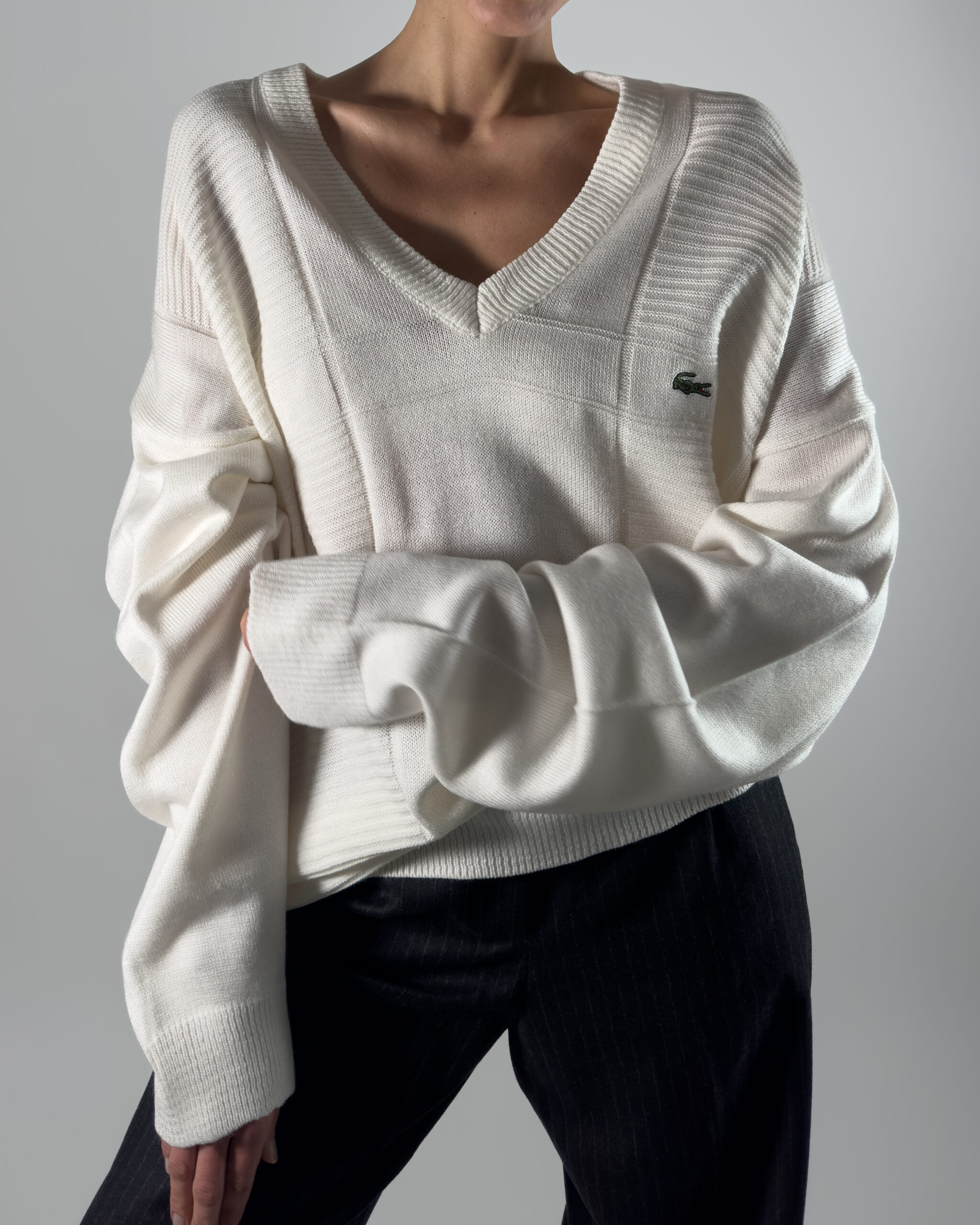 Classic Lacoste v-neck sweater offers a relaxed fit with breathable texture. Made in France