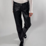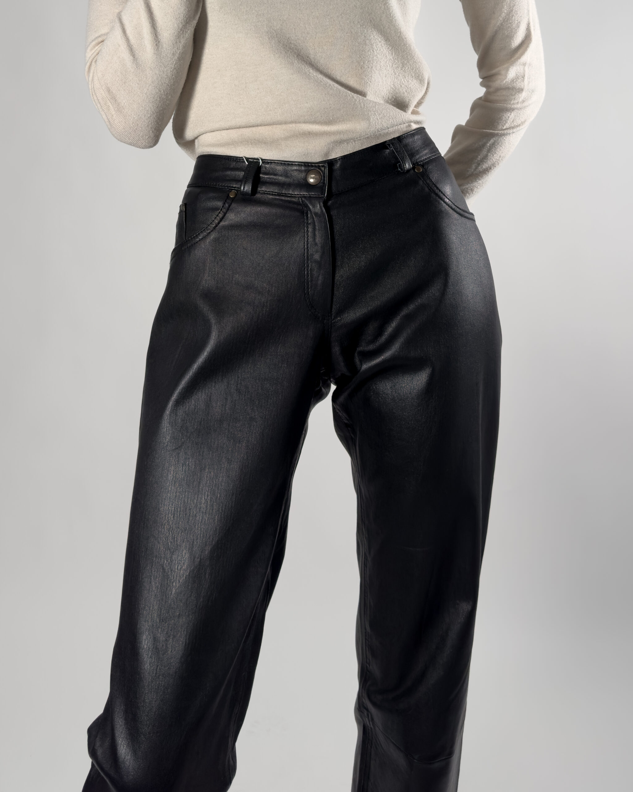 Leather trousers in classic black. Designed with zipper closure, belt holes, and functional front pockets.