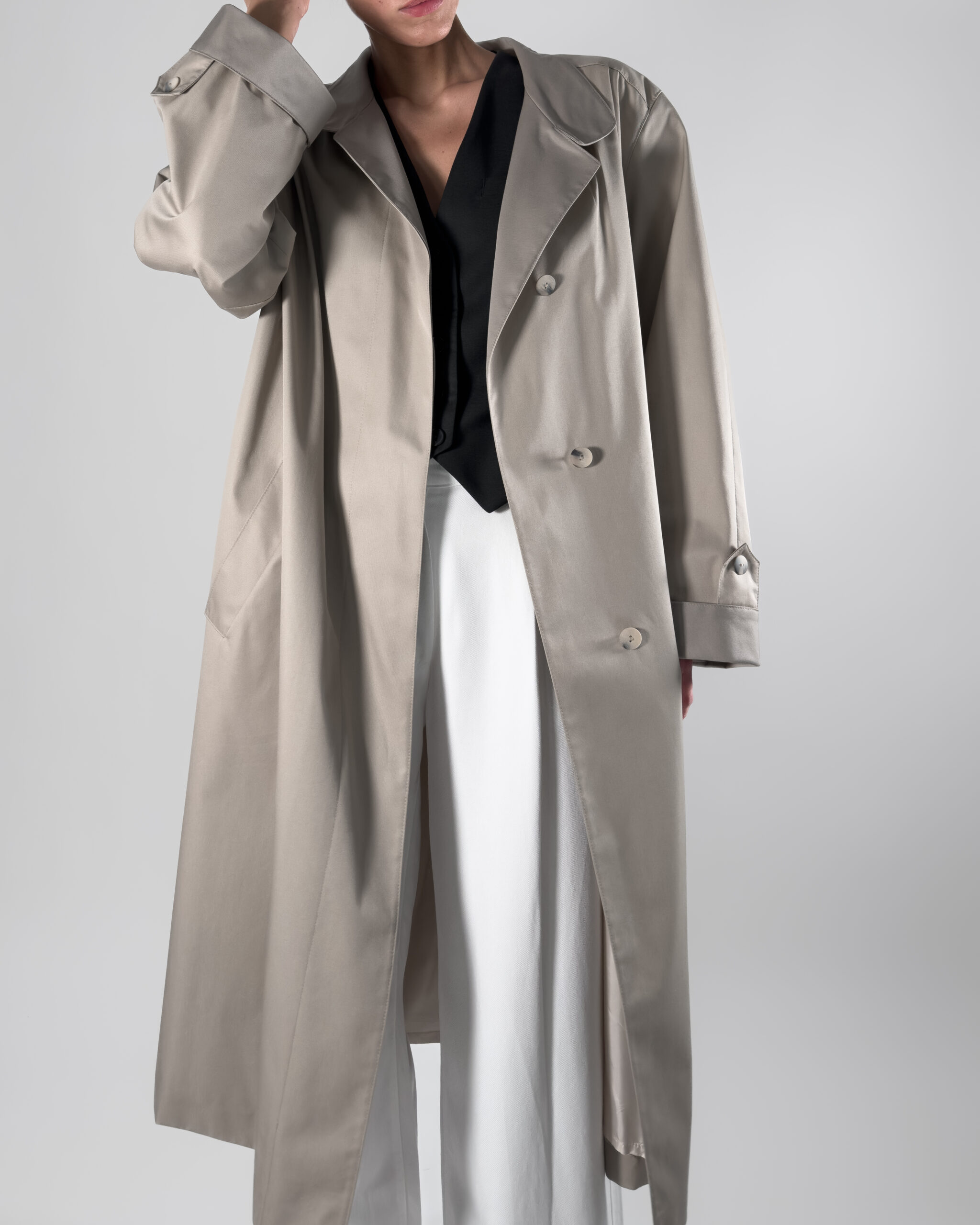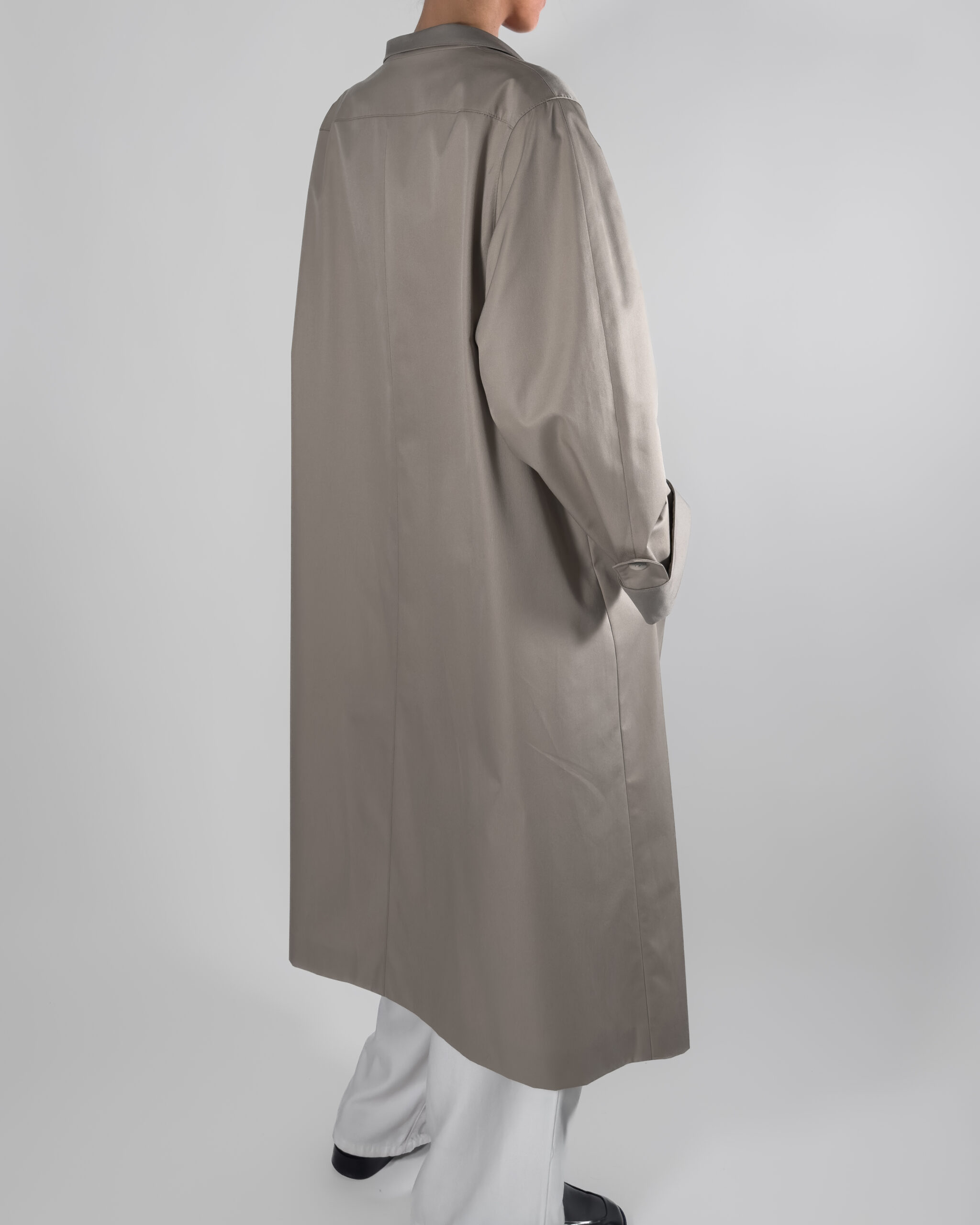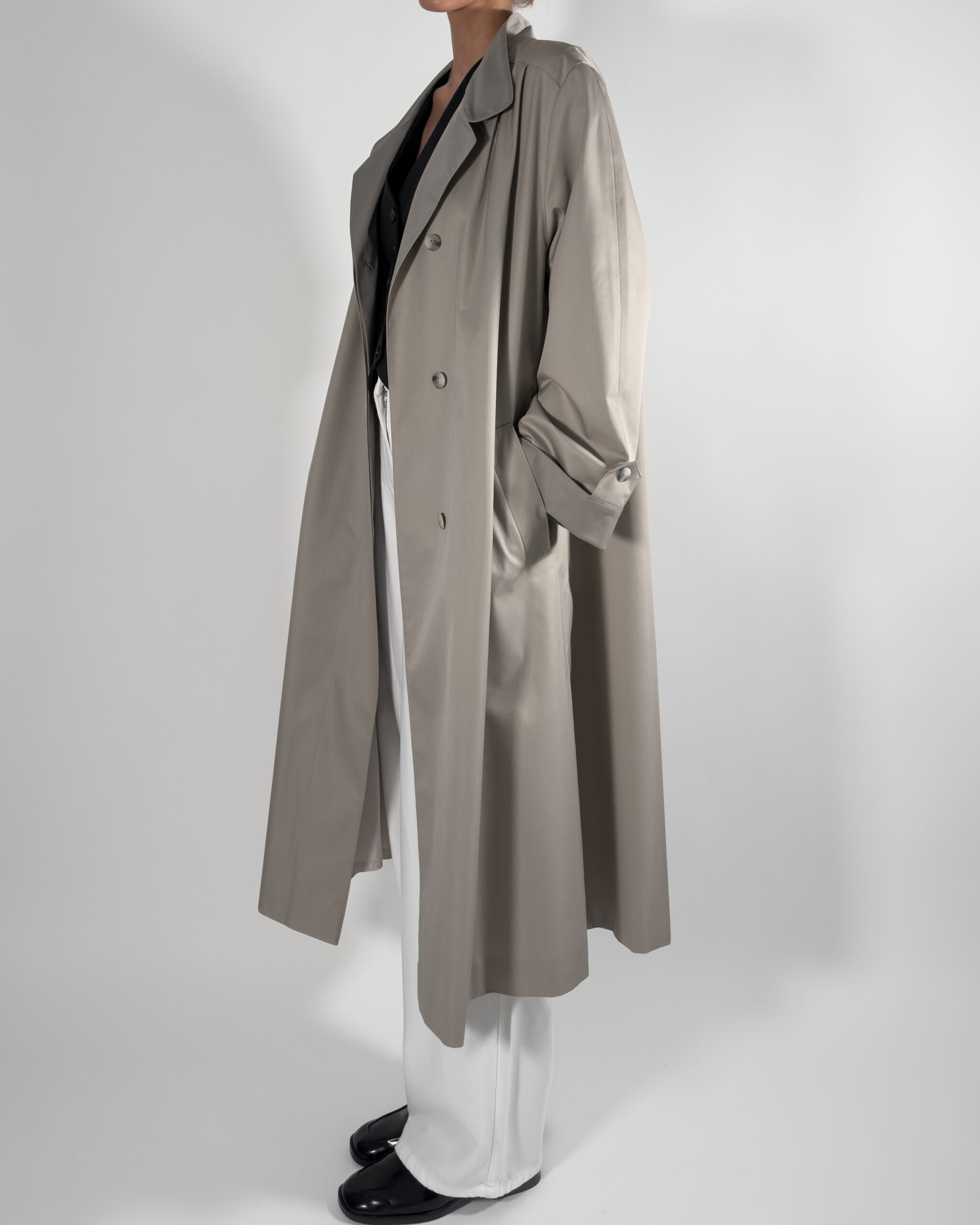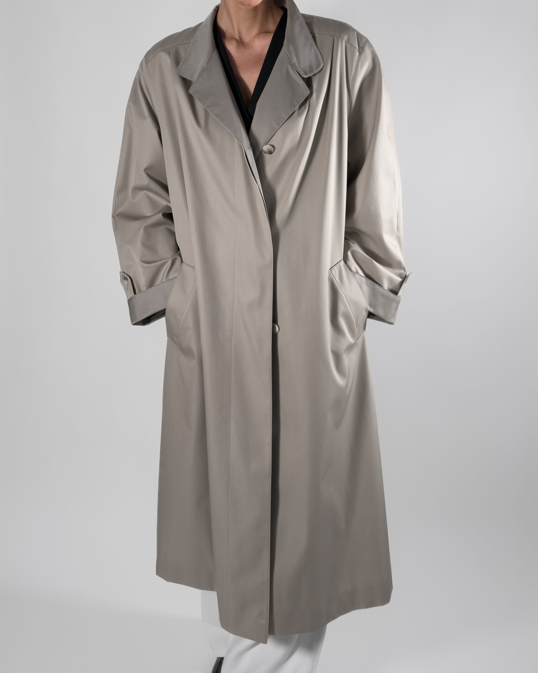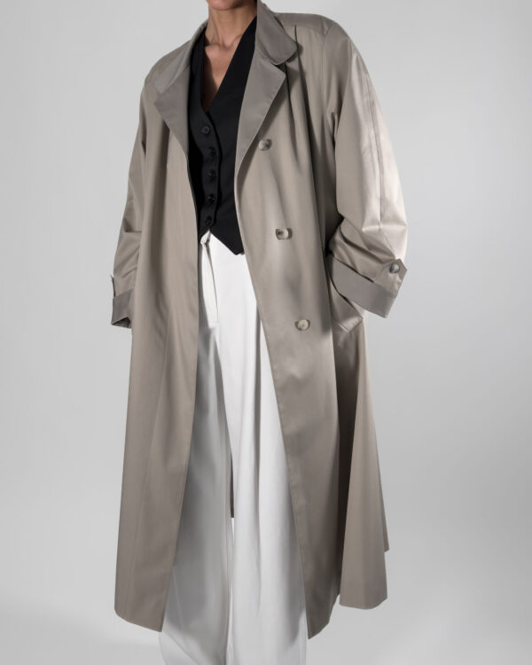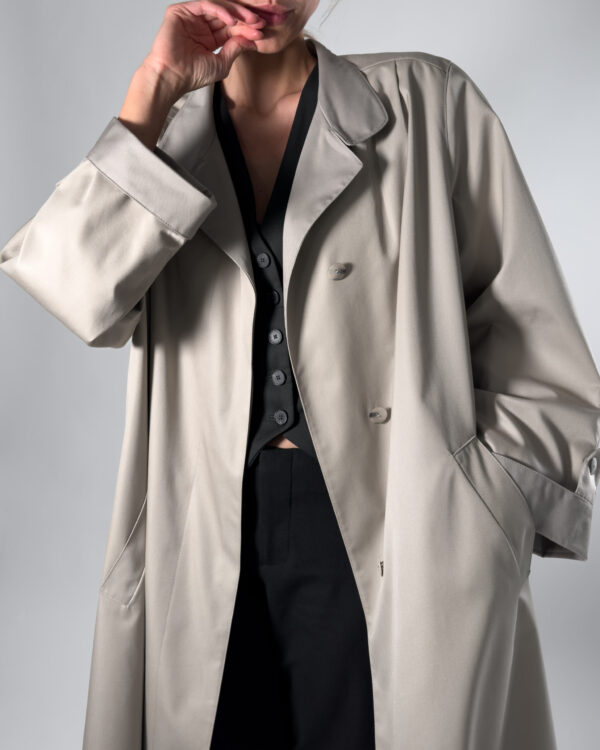 Trench coat in light beige/ grey hue. Labelled as Nino, De luxe Diolen.