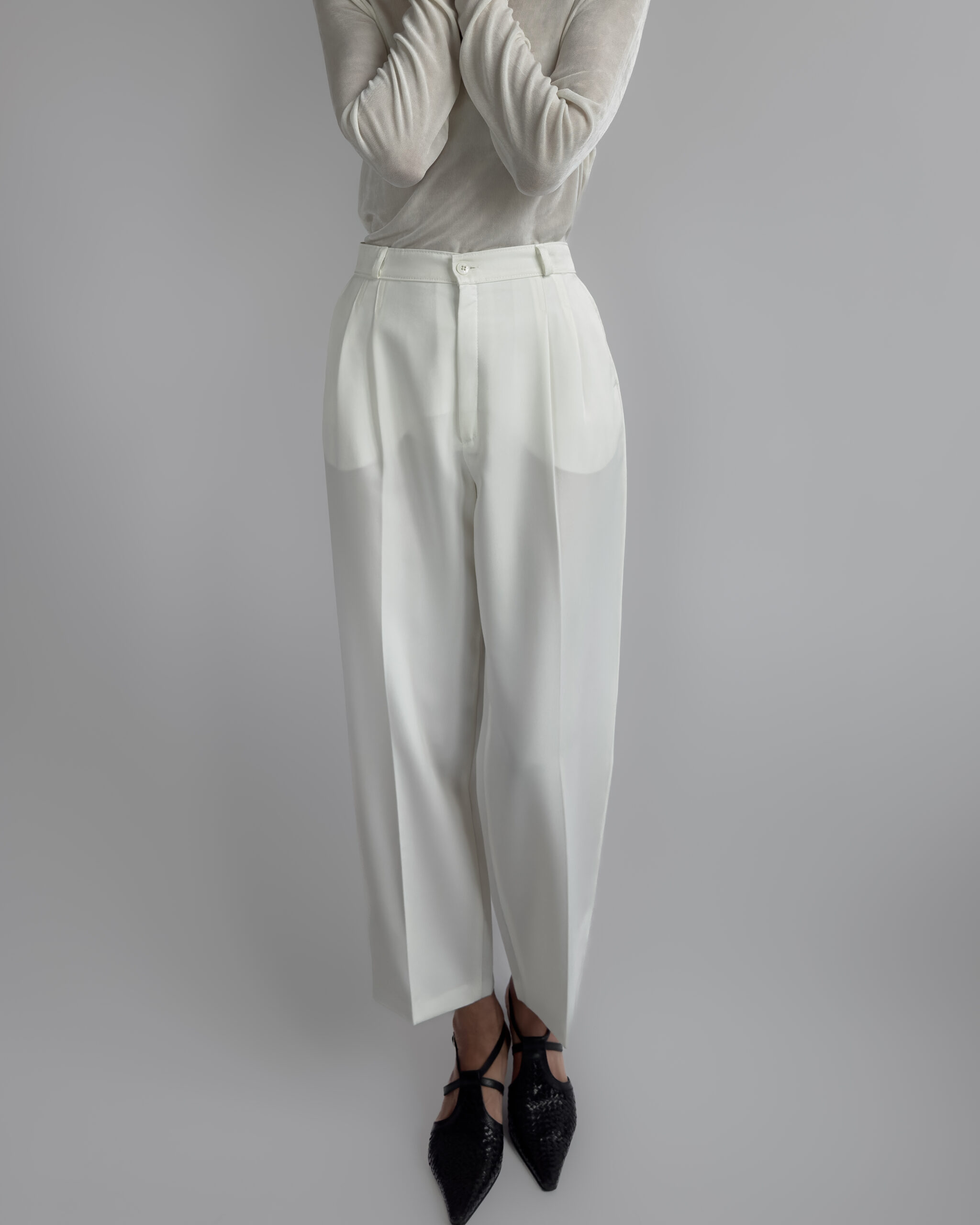 Classic pleated suit trousers in a soft cream white tone. Relaxed tailored fit with front pleats and slightly tapered leg. Smooth fabric with light structure.