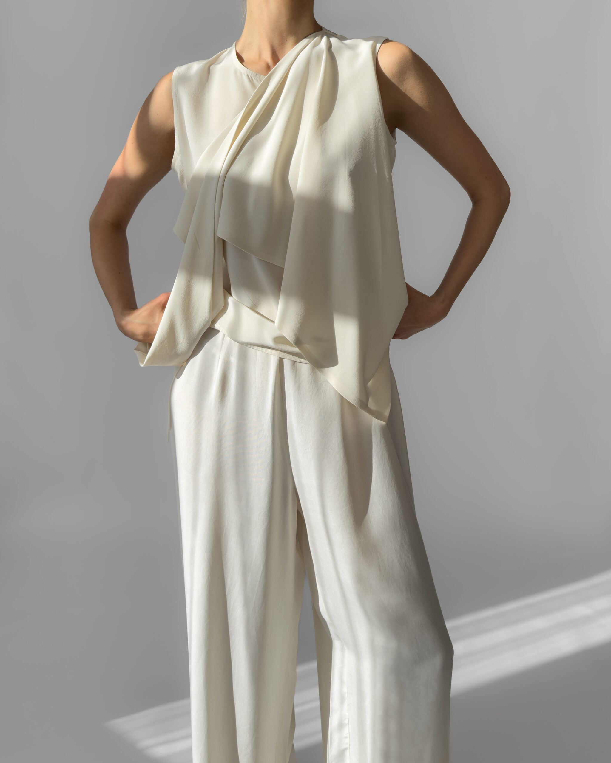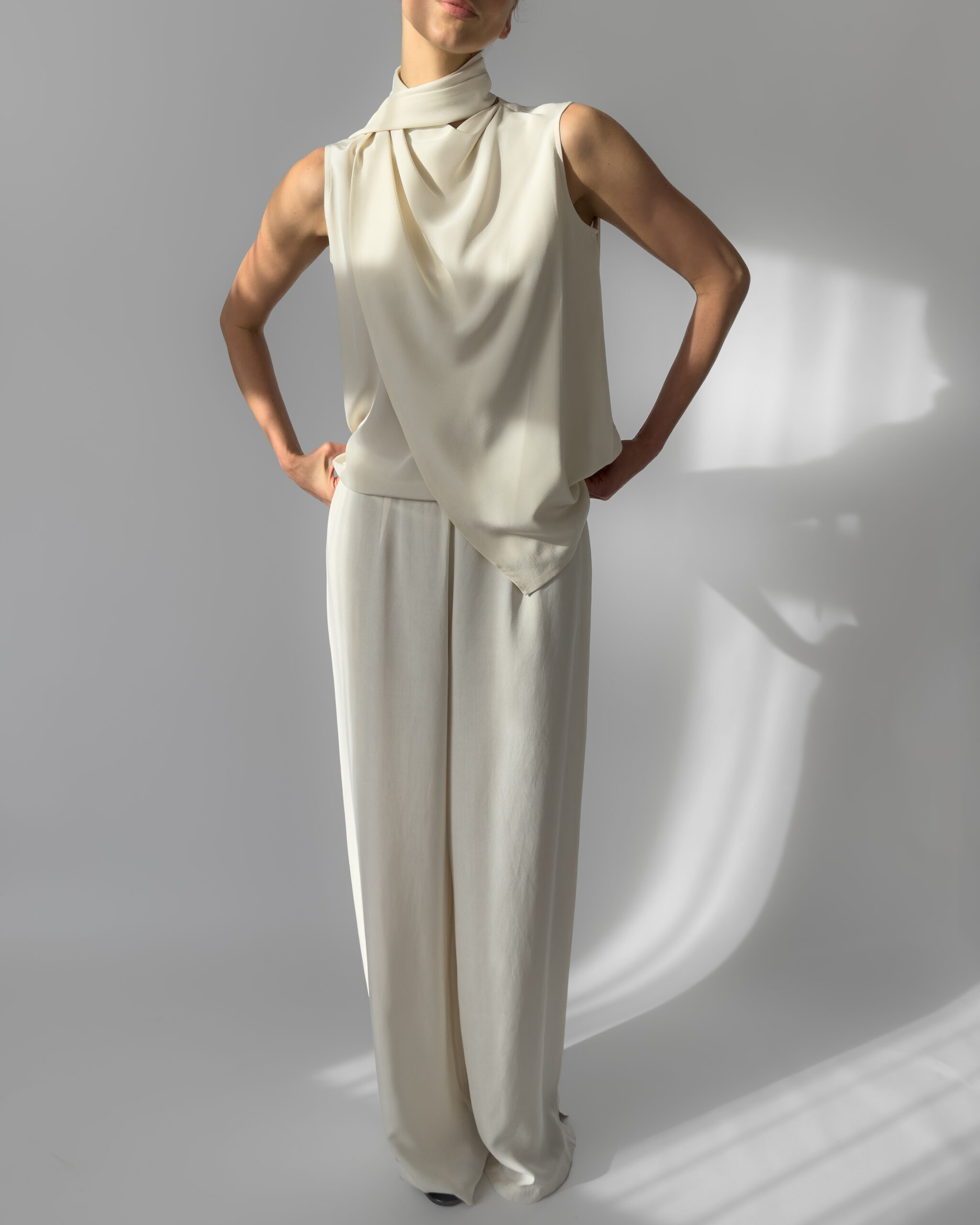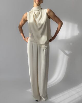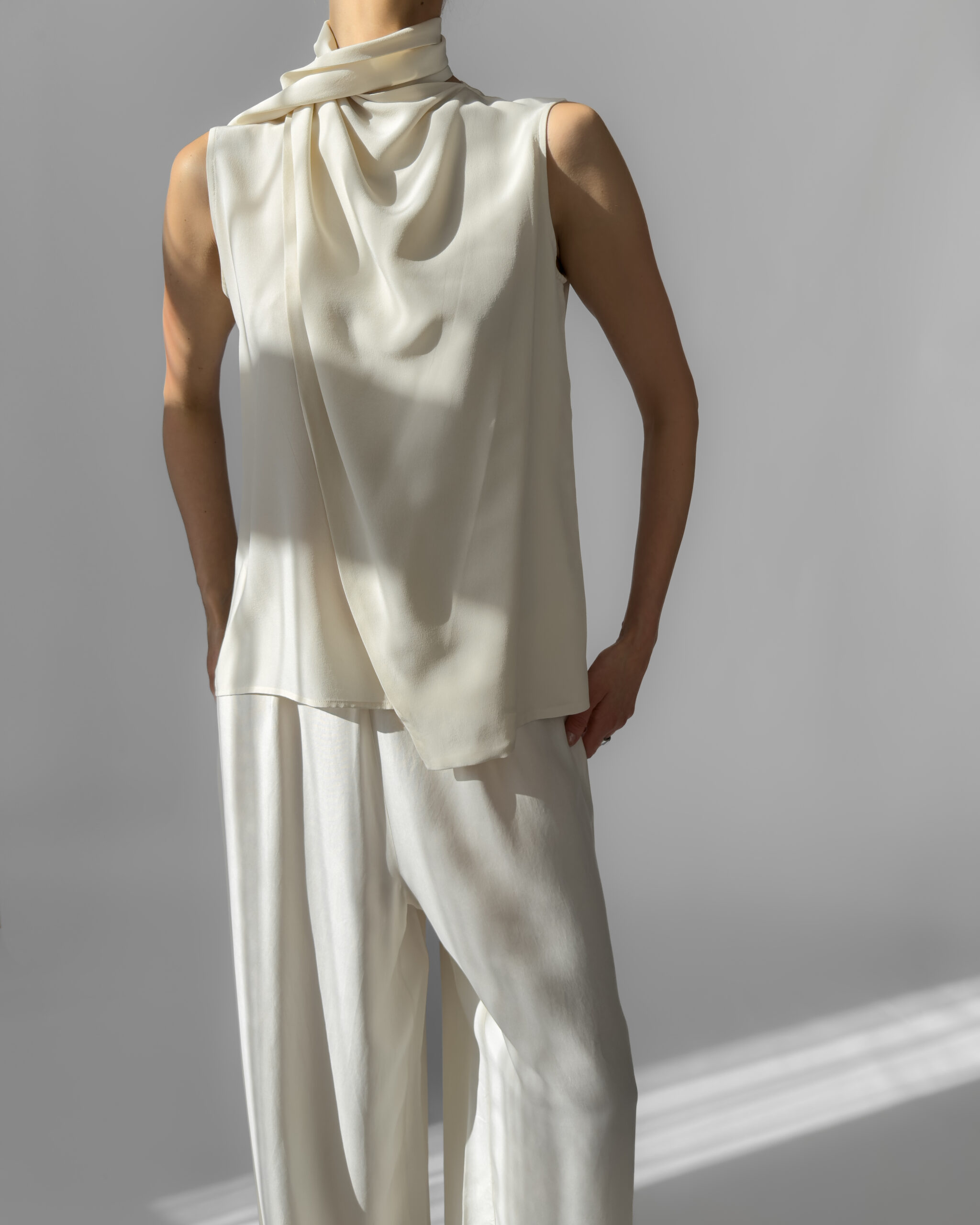 Elegant 100% silk blouse in a soft cream white shade. Features a draped scarf detail that allows for multiple styling options—tie, drape, or twist for a modern, chic look. Lightweight and fluid.