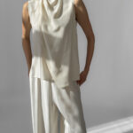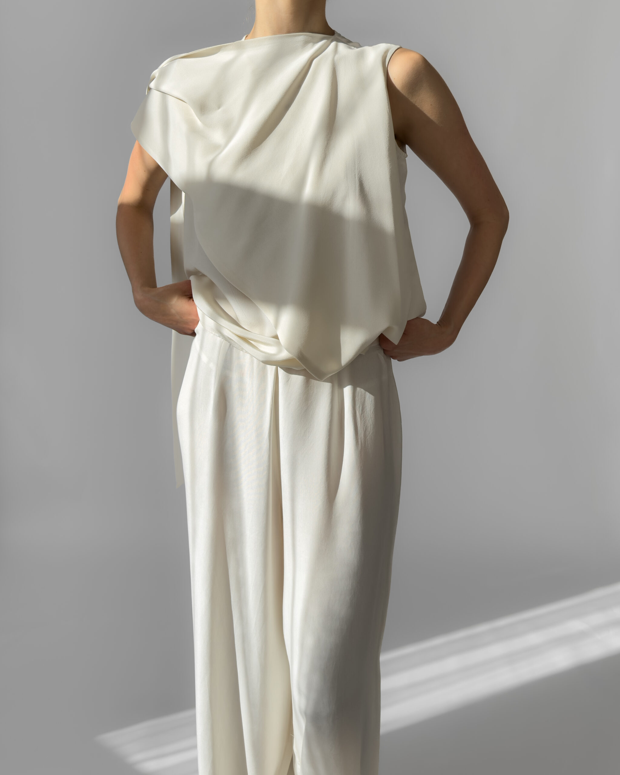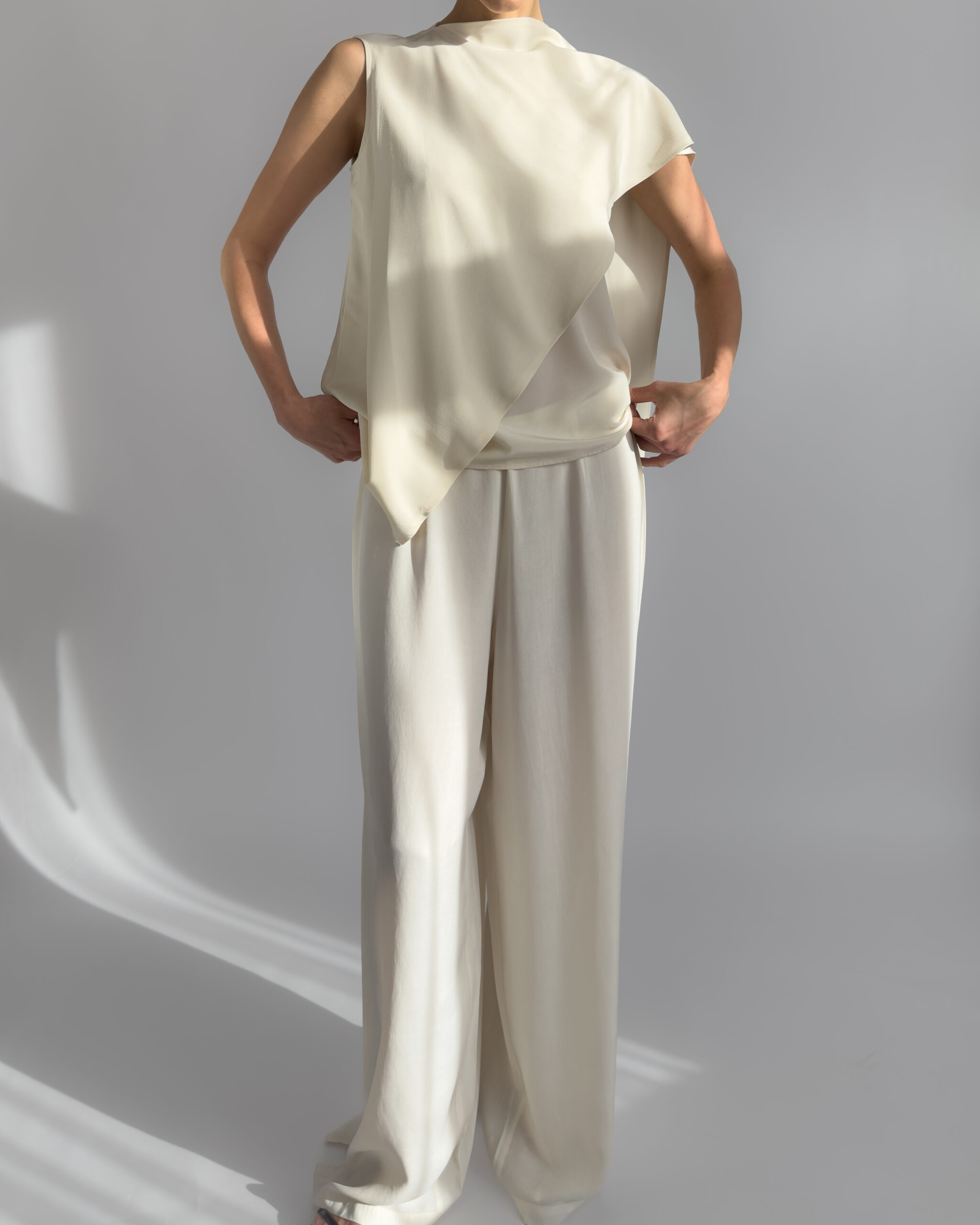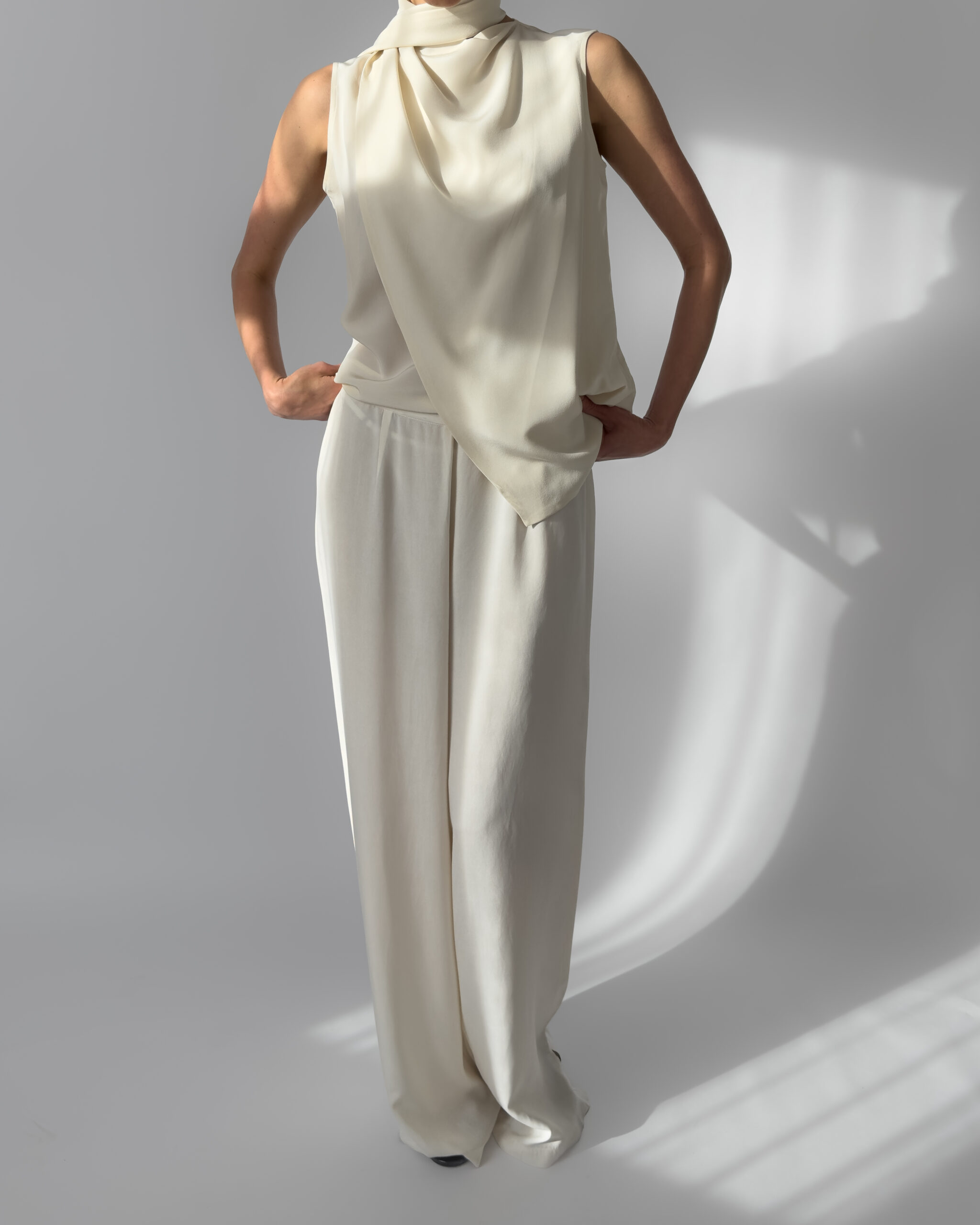 Elegant 100% silk blouse in a soft cream white shade. Features a draped scarf detail that allows for multiple styling options—tie, drape, or twist for a modern, chic look. Lightweight and fluid.