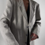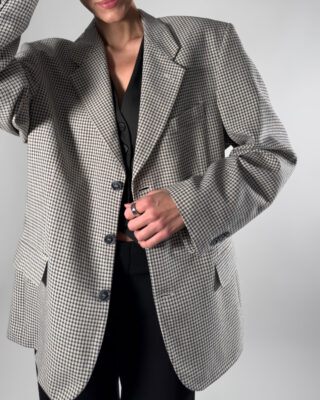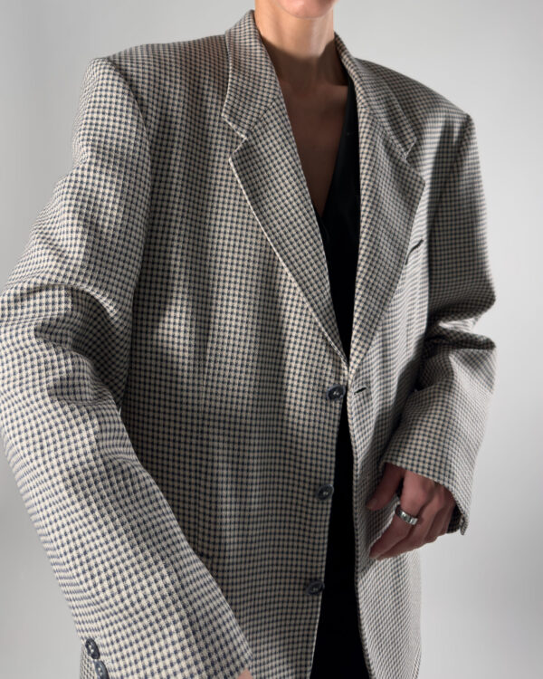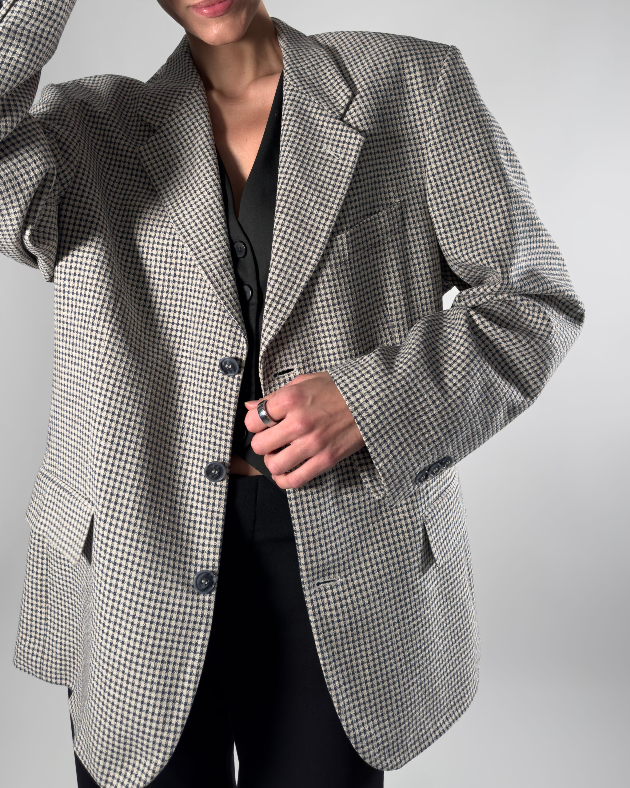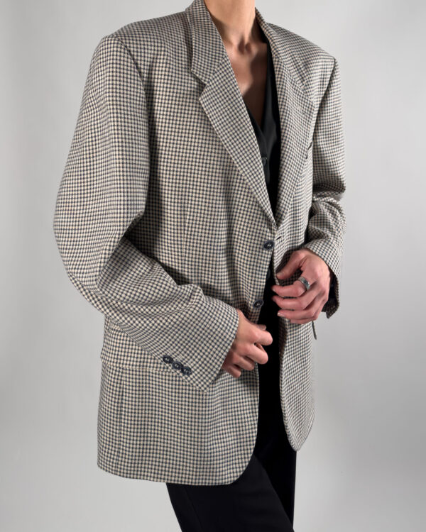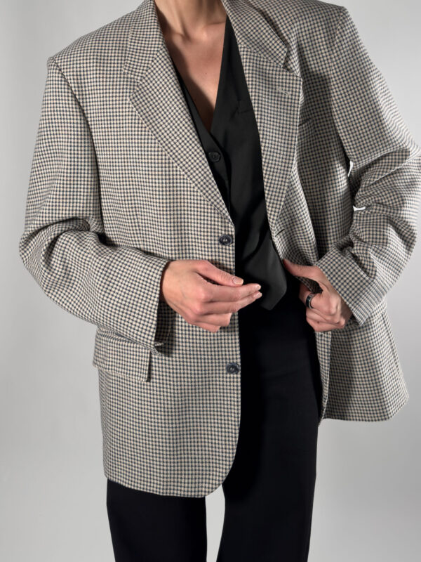 Silk blend checkered oversized blazer in a combination of beige and light blue. Labelled as size D26
