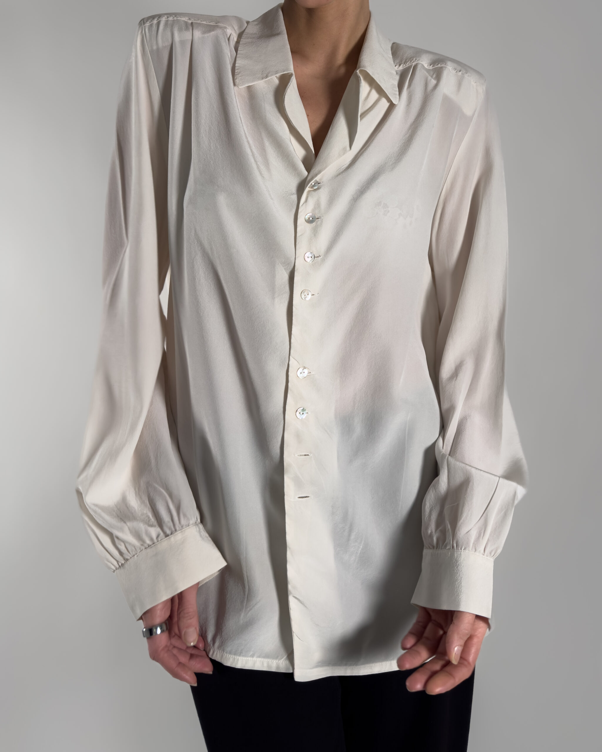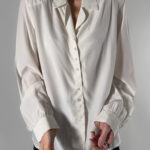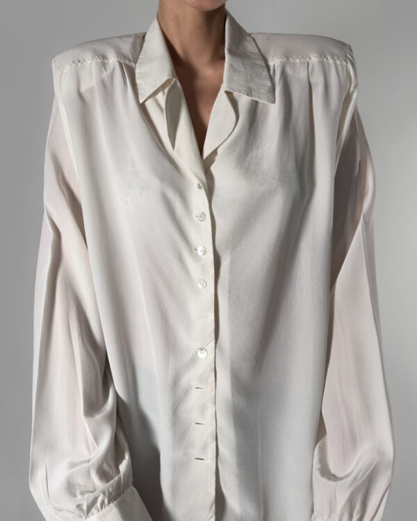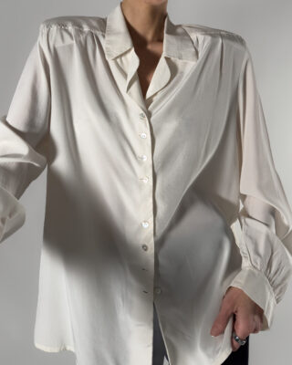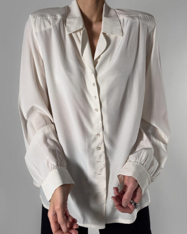 Timeless silk blouse, made in Italy. Its classic design and soft cream-white hue make it a perfect piece for both formal and casual looks.
