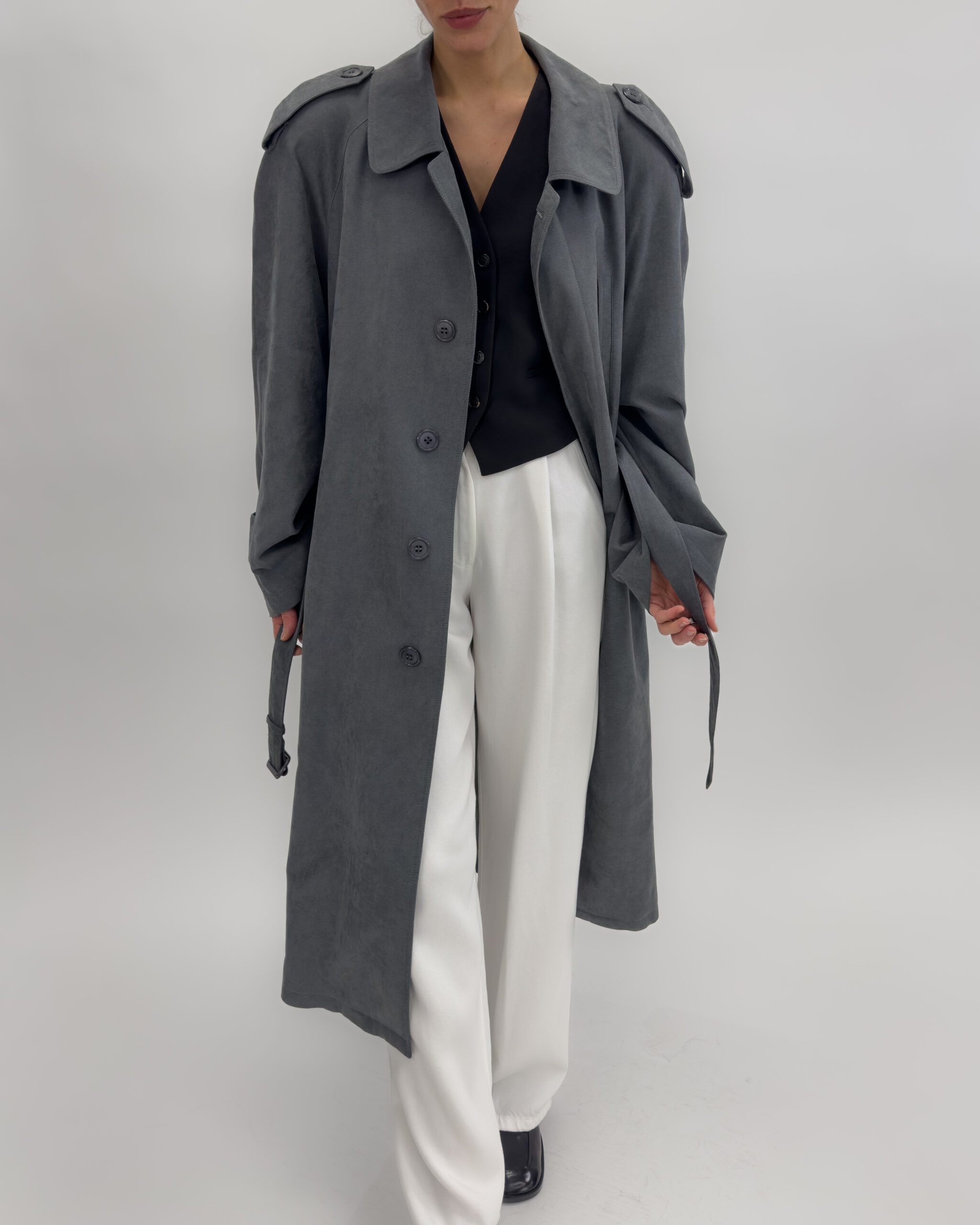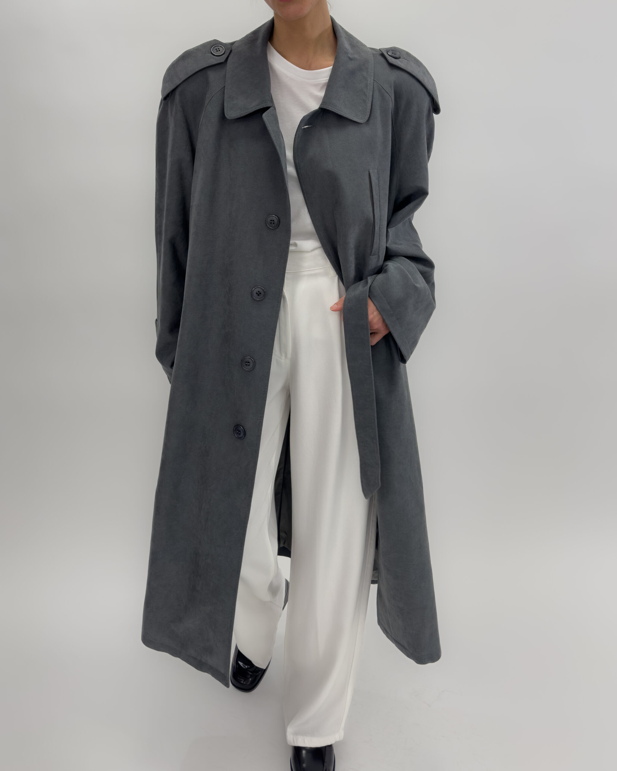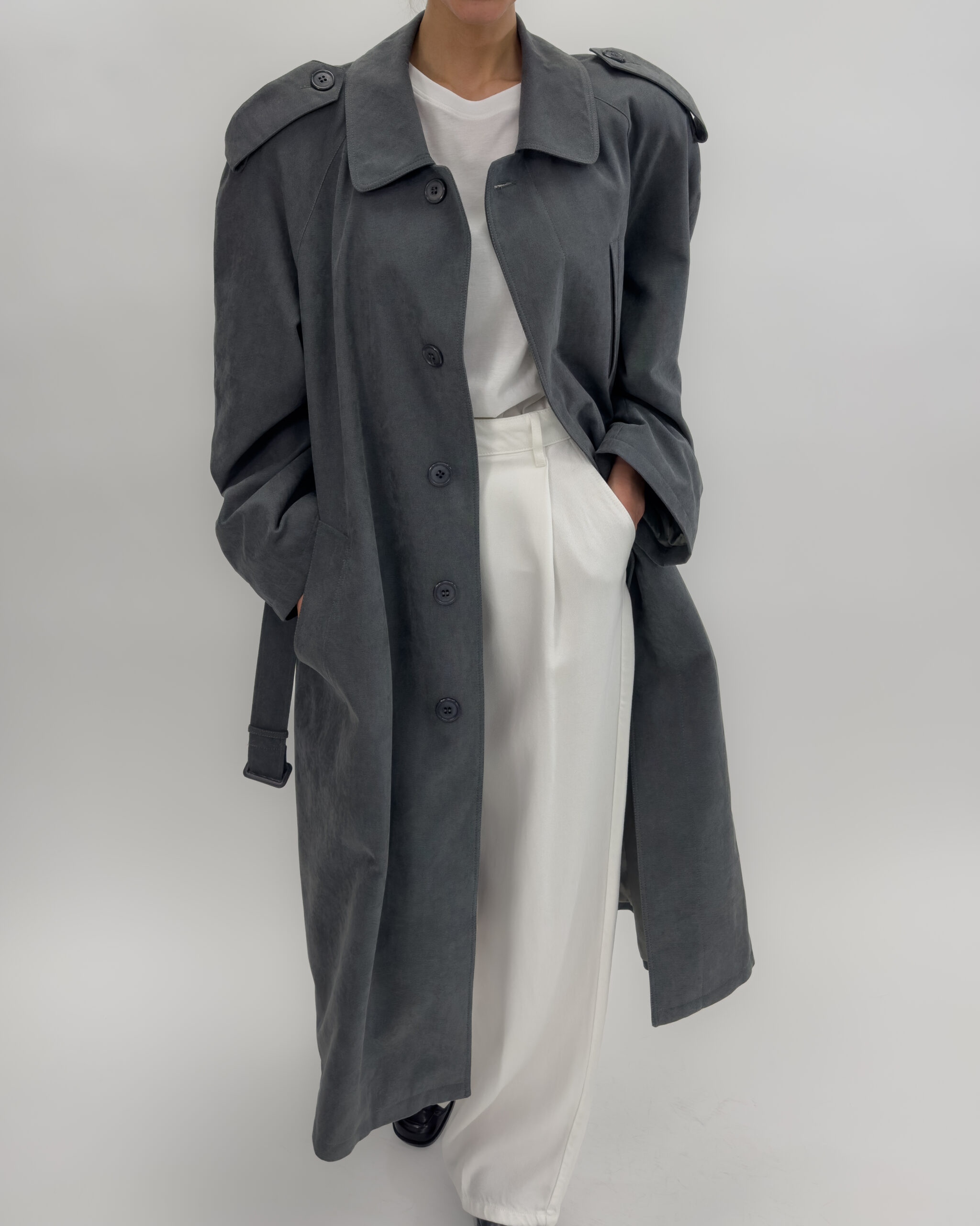 Shoulder pads, button-up front, multiple pockets, belted waist, and back slit