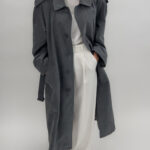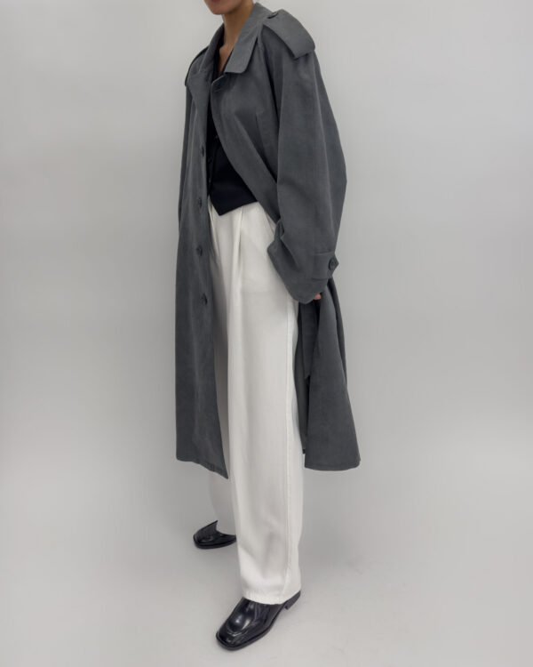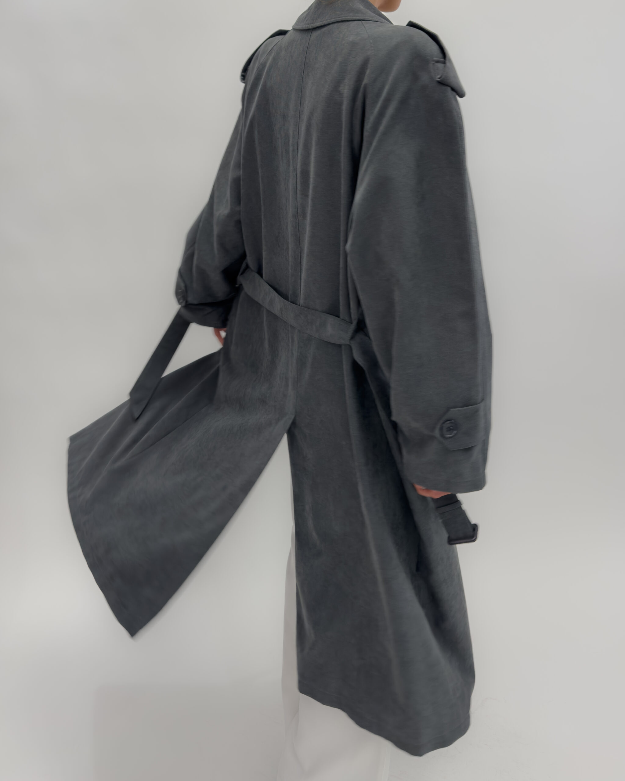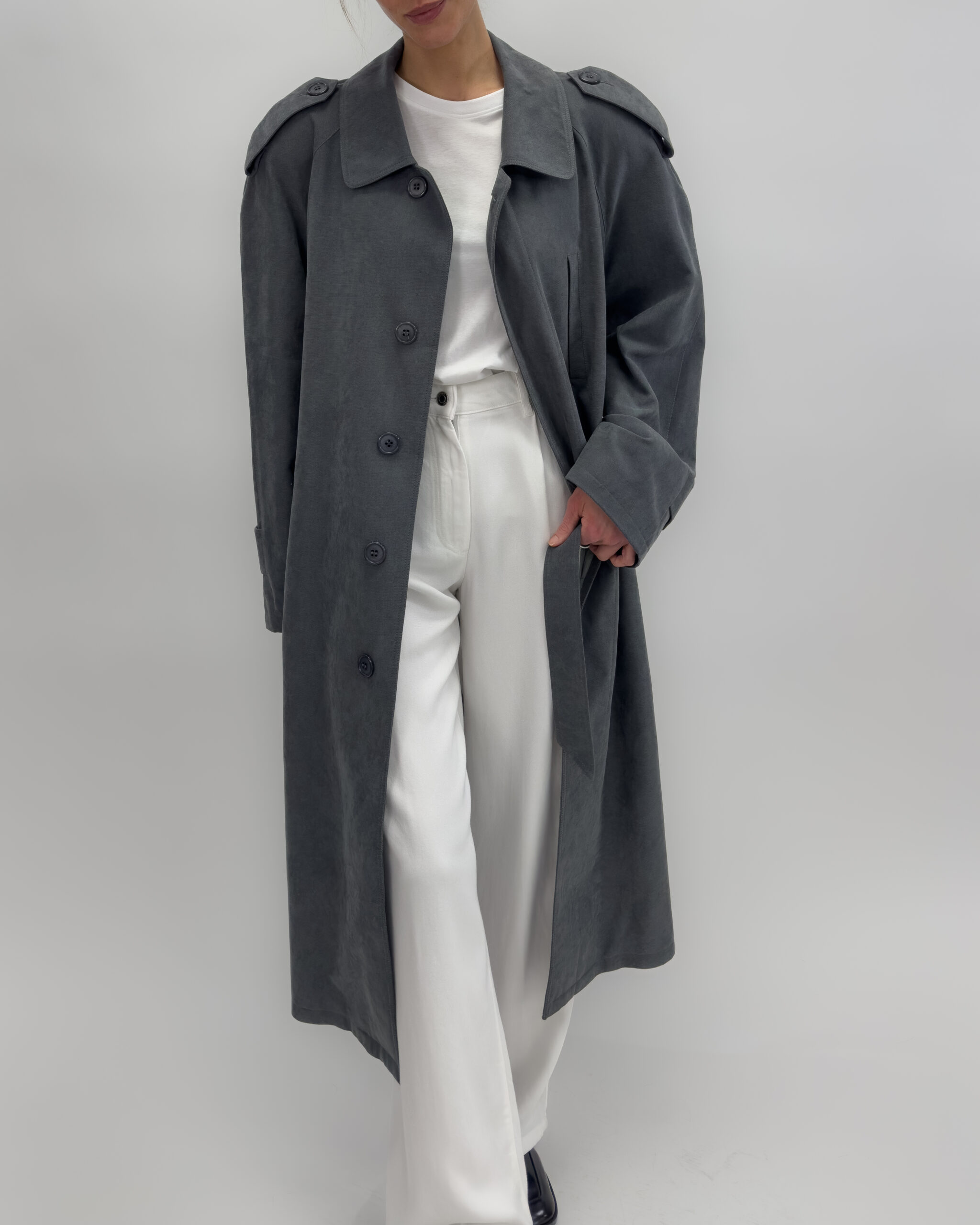 Shoulder pads, button-up front, multiple pockets, belted waist, and back slit